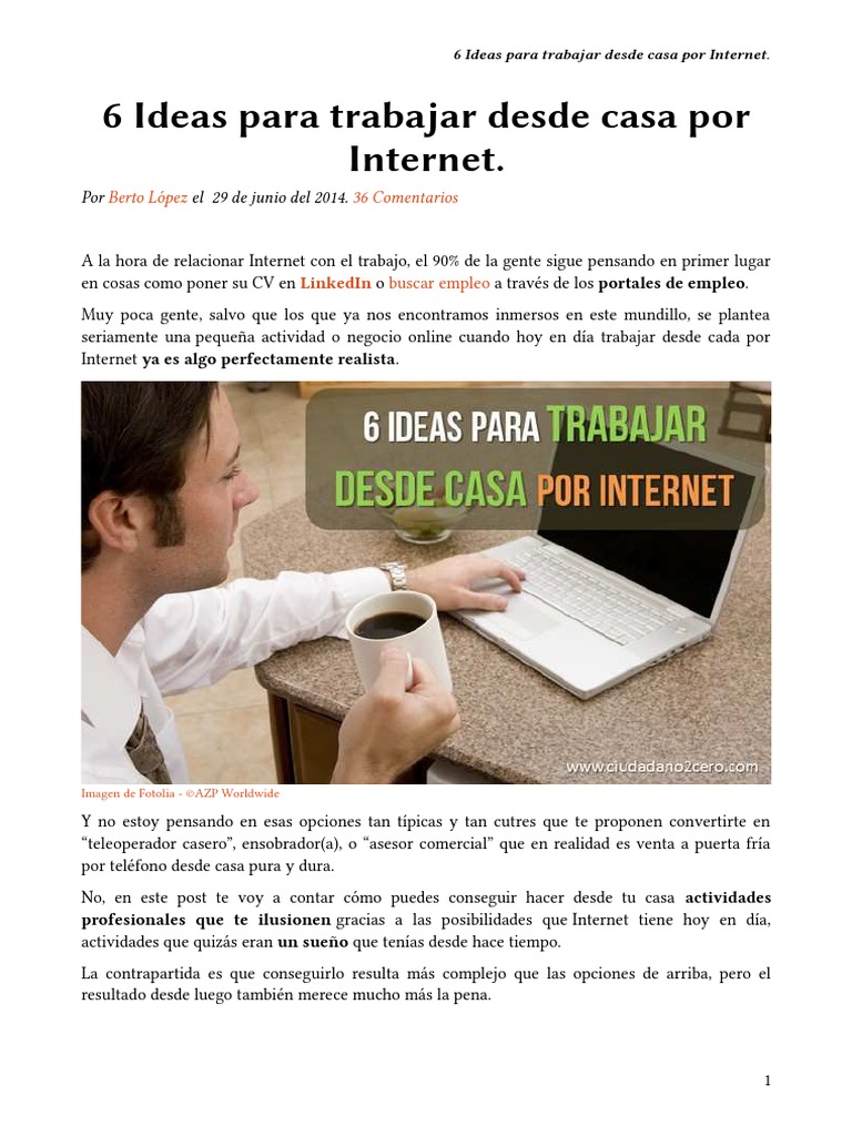 15 formas para trabajar desde casa por internet que te pueden dar un sobresueldo e incluso convertirse en tu. Trabajo desde casa por internet. Finalmente, me gustaría que me contaras tu opinión sobre el artículo y me dijeras si ya. No esperes que el trabajo vaya a tu casa o que vayas a ganar dinero por internet en 2 días como hace «pepito». Es importante tener clara la diferencia entre ser freelance y trabajar de forma remota para una y verás que cuando pruebes toda la flexibilidad, libertad y autonomía que te brinda el trabajo por internet, ya no querrás volver a un esquema.